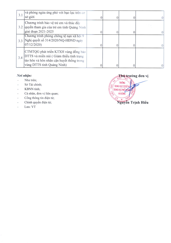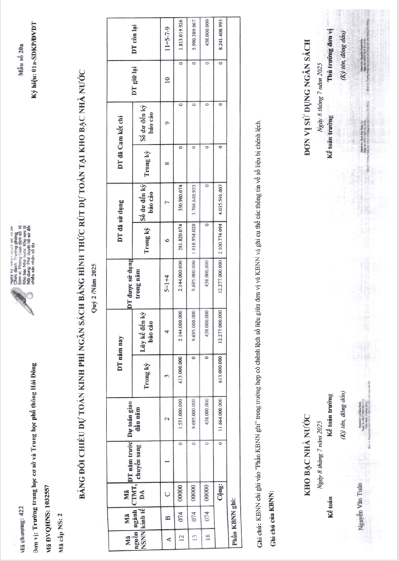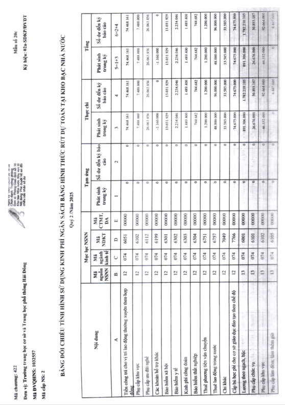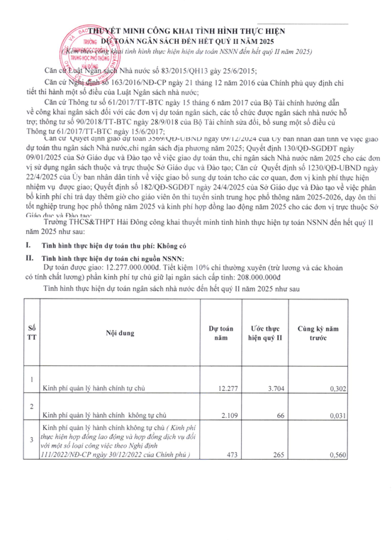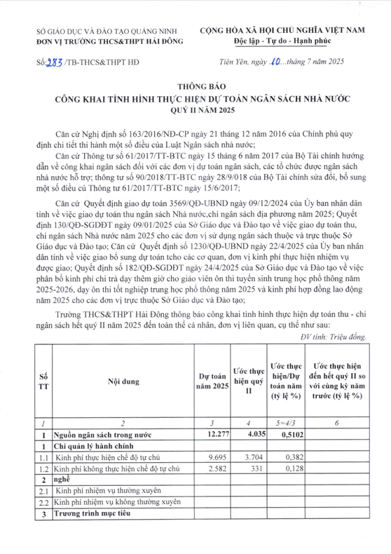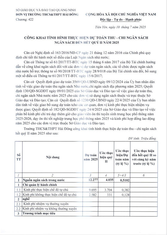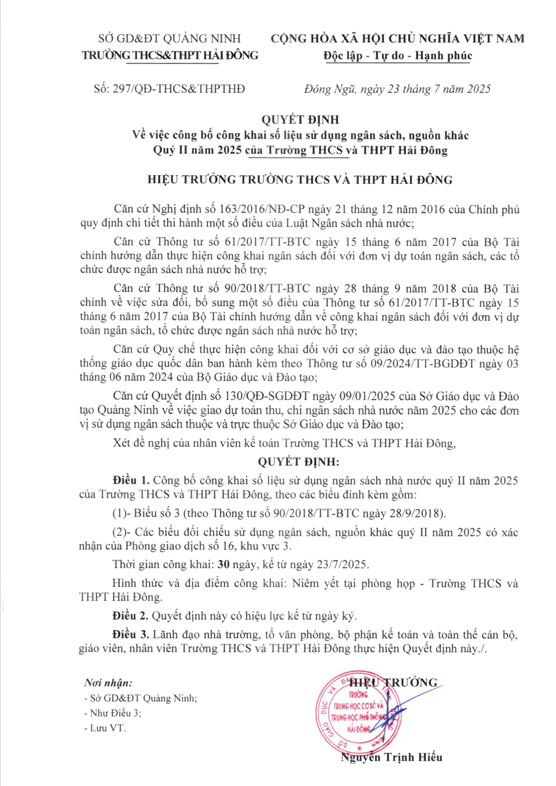 Quyết định công khai số liệu sử dụng ngân sách, nguồn khác Quý II năm 2025 của trường THCS&THPT Hải Đông